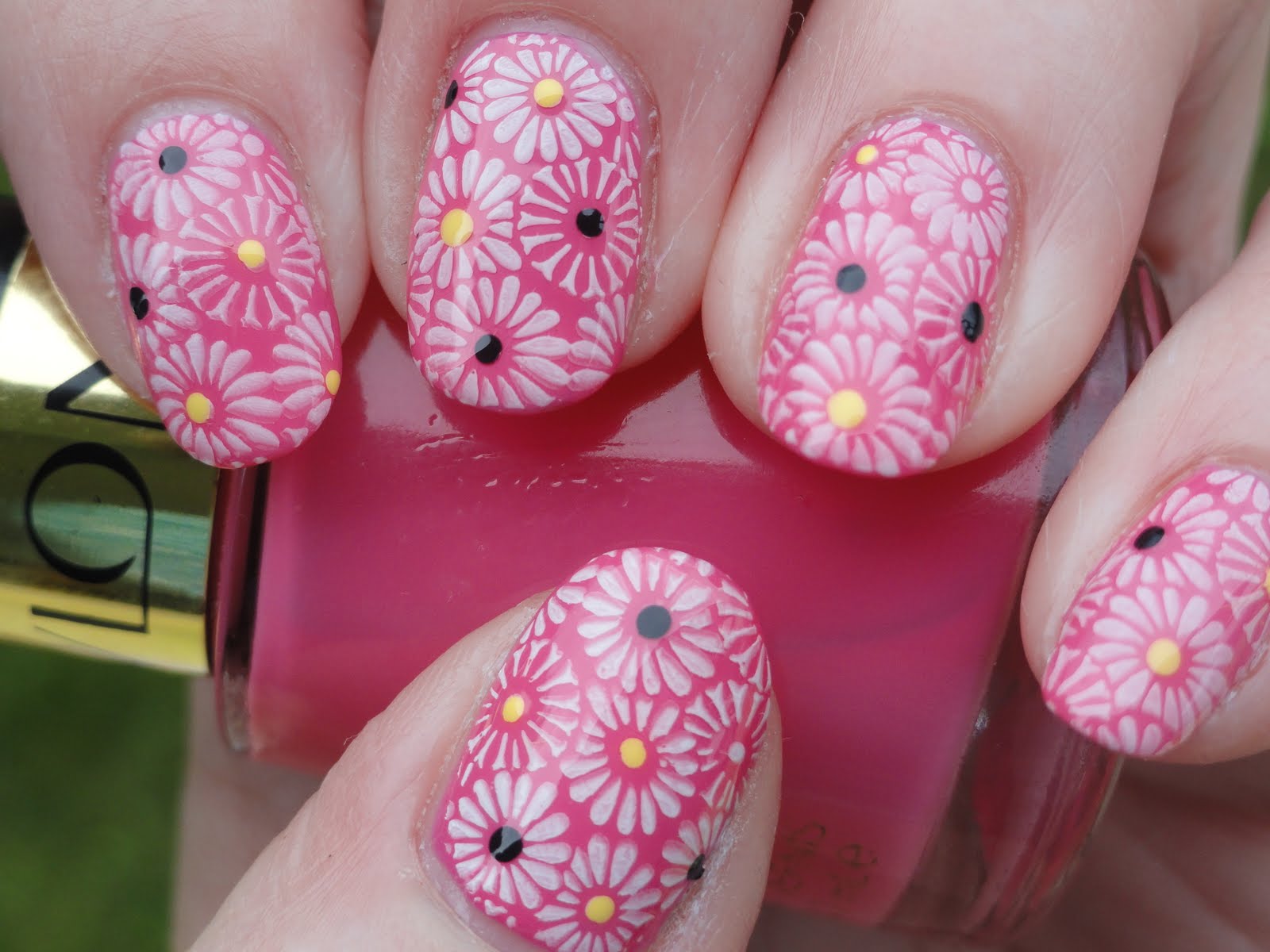 Revlon Sweet Tart, stamped with white Konad special polish using SdP 4. Here's mani in progress.
