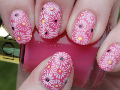 If you think it looks familiar, it's pretty similar to a mani I did here a while back. Right now, these are my favourite type of mani's (if you've followed me for a while now, you'll know I've posted quite a few variances of these); the full plate image, usually with some type of flower or swirl or something that I can add a few dots too). It's mainly a time issue; they are one plate, easy to apply as fairly forgiving if you don't line them up well, and the dots jazz it up for a bit of interest. And because I did this mani about an hour before I was heading out for the night on Sunday, it fit the quick change mani criteria I needed at the time!