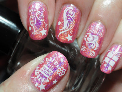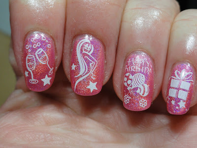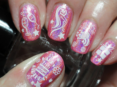 Stamped using CH36 (sunglasses on index, sun image on a few different fingers), SdP 57 (beach theme on middle, fish on index, butterfly on thumb), SdP 75 (bare feet and boat on thumb), Soft stamp A30 (swimsuit on ring) and SdP 1 (ice cream on pinky...except I took small brush and removed face image before I stamped it so it was just a plain ice cream cone!)