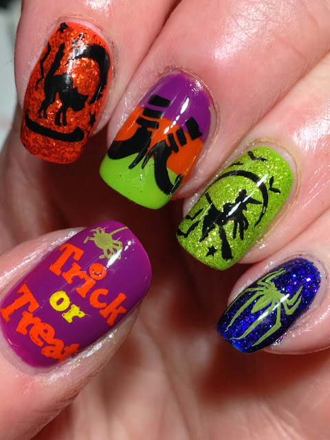On the middle finger, did a taped mani using the orange and purple base coats and then added glitter on the index and ring fingers. The glitter over the index is Claire's Pumpkin and Nubar Lime Green Glitter over the index. My tape mani's still need some I can see!