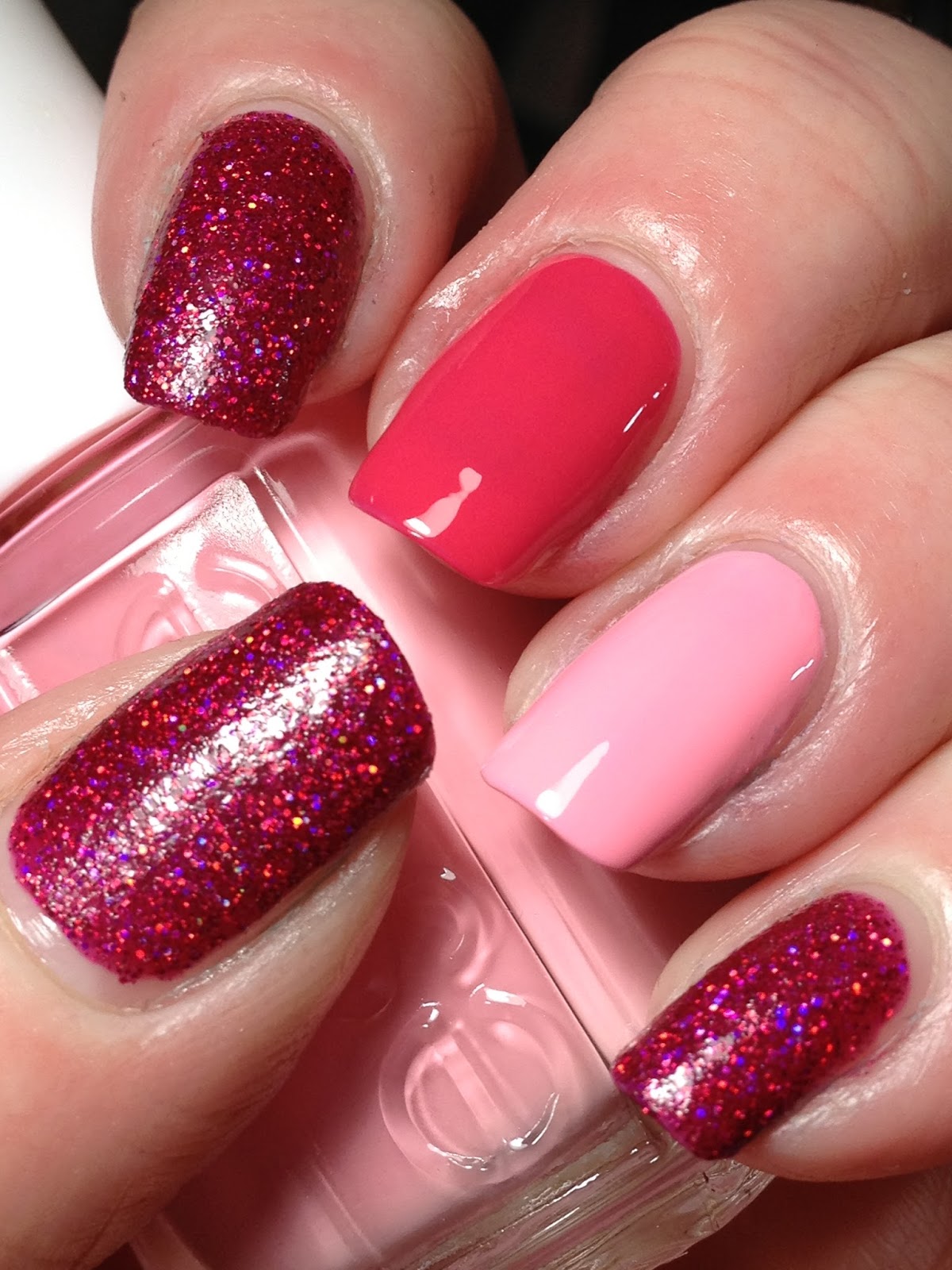Started with a base of two coats of Illyrian Polish Killer Queen on three fingers with Essie Brides No Grooms on middle and Essie Groove Is In the Heart on ring. No top coat. I'm not sure why I came up with this combo; I didn't want glitter on all the nails and my typical accent is the ring finger and just wanted to change it up a bit.
