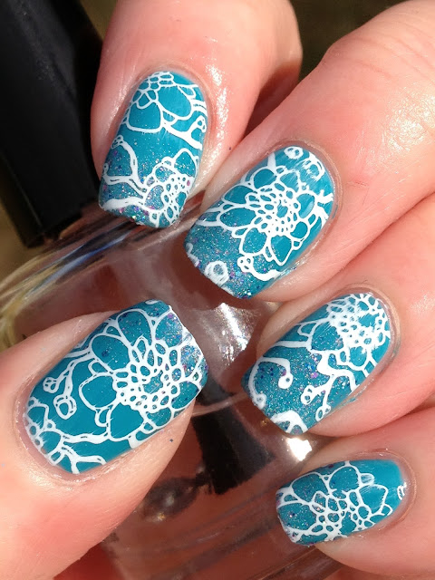 I had also ordered UberChic Collection 10, also available from Girly Bits, and, using an image from UC 10-01, placed different bits of the image on each nail for some interest. Stamping polish used was Funky Fingers Gesso.
