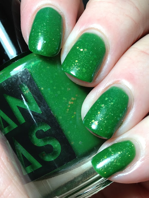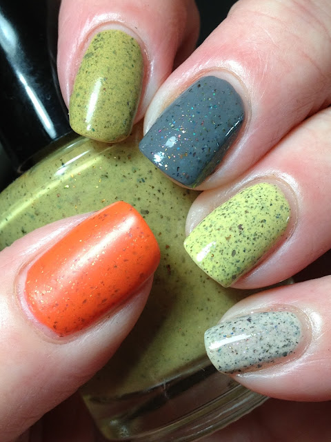 Started with a base of flaky skittles; polishes starting at thumb and going clockwise are Pahlish Bespoke Mauna Loa, Pretty & Polished Fuzzy Sweater, Barry M Grey with a coat of Frenzy Dauntless, Great Lakes Lacquer The Last Sliver of Sun and Great Lakes Don't Forget the Whip. All are two coats, no top coat, except the middle which is one coat of each.
