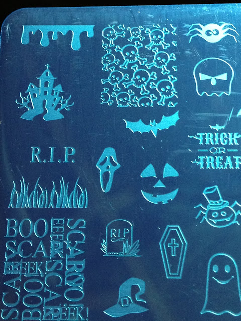 I had a few left over stamper decals so applied them to Ms. Cindy; images are from DXE04 (ring, middle and index), the thumb is from Messy Mansion MM22 and the very adorable ghost is from Chez Halloween 005. The words on the pinky are from DXE23.