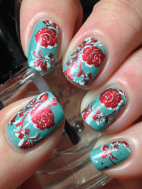 I actually thought the above nails were pret-ty cool but decided to do some double stamping as I was doing Vday mani's at the time I did these and was in a Valentine's state of mind! Picked a heart from MoYou Pro 09 and stamped in the middle of each nail (well, as best as I could; still not perfect even with clear stamper!)