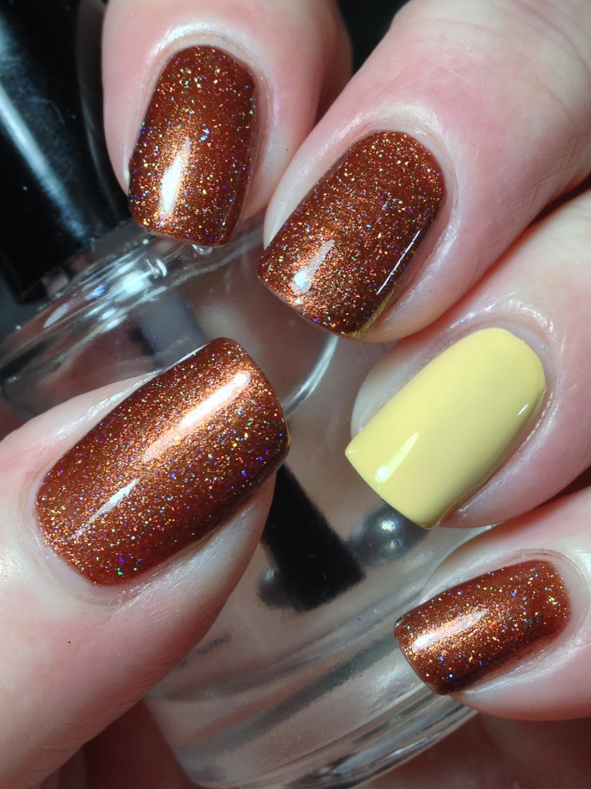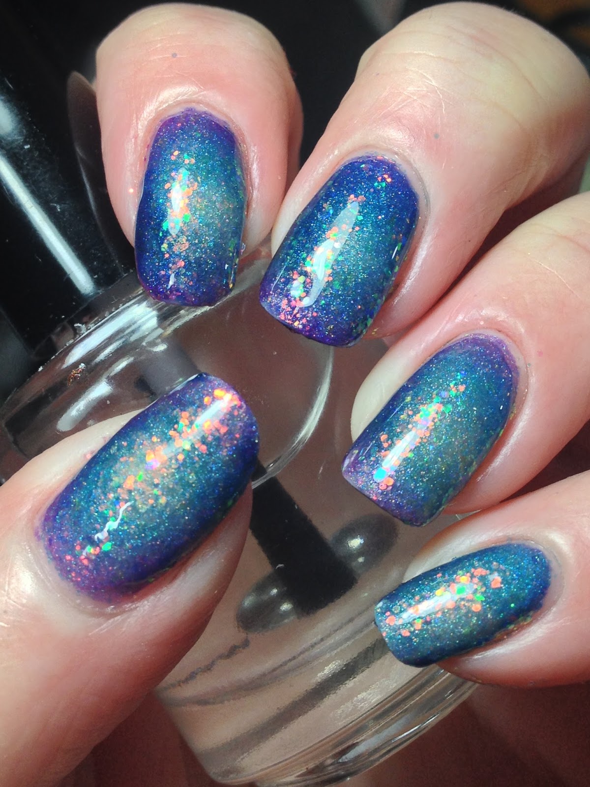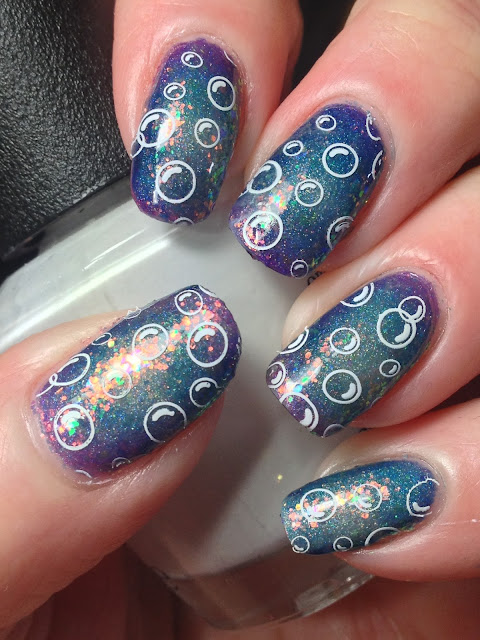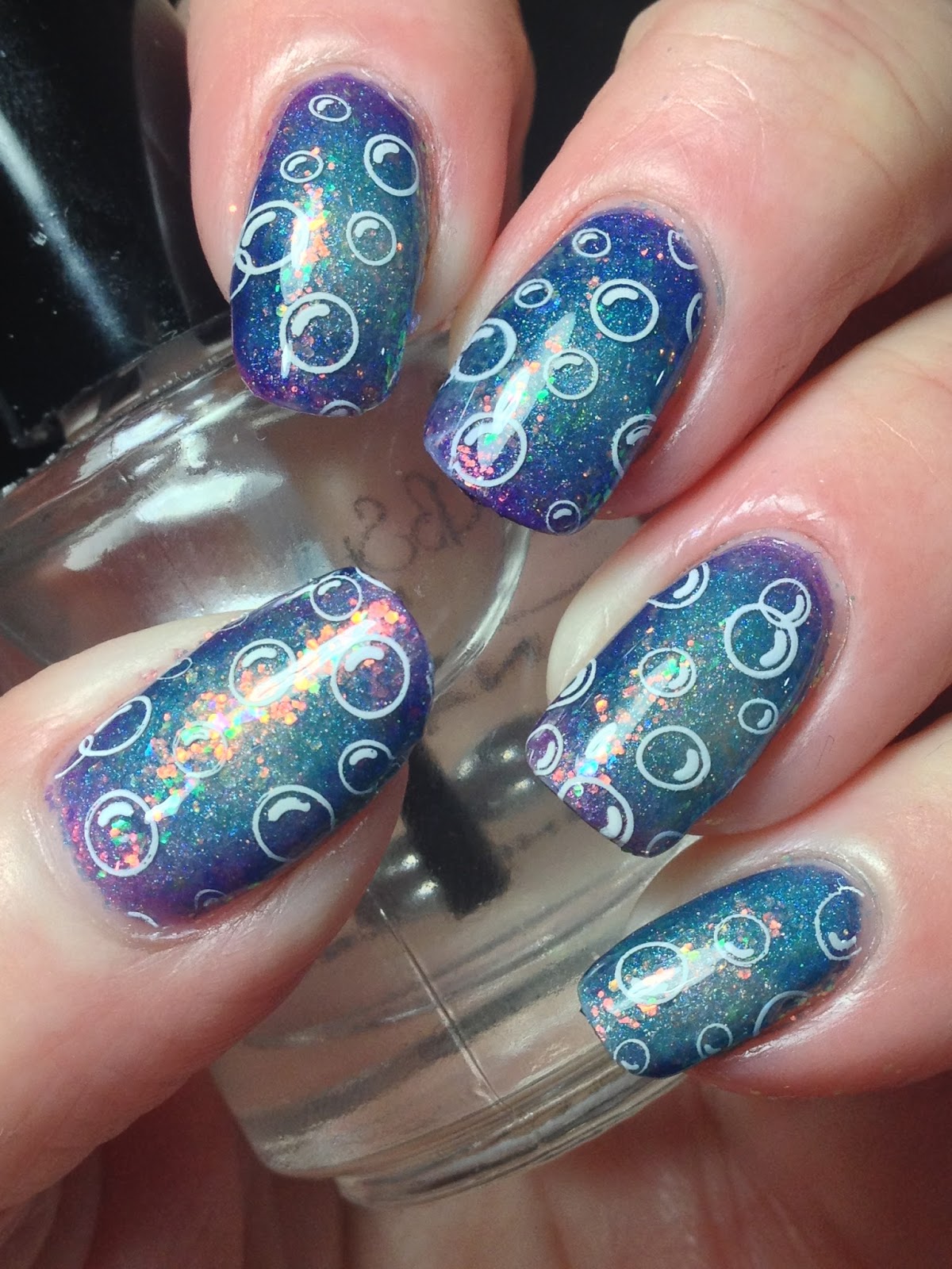 I thought the iridescent glitters in the Enchanted Opals would give that oil slick kinda look in the bubbles so used them for a radial gradient. Used Enchanted Opals & Cream, Opal Lagoon, Opal Nectar and Candied Opal. In hindsight, I wish I had have done the base a little darker but these polishes are fairly goopy and not that opaque so I had had enough with doing sponging even to get them to this opacity.