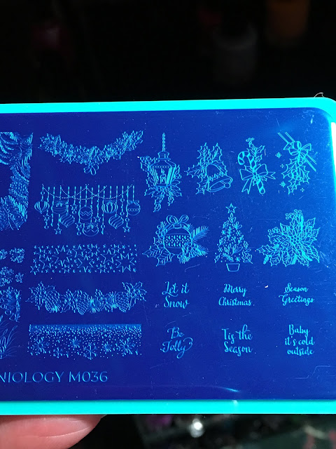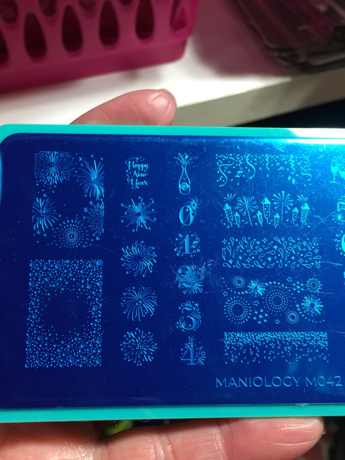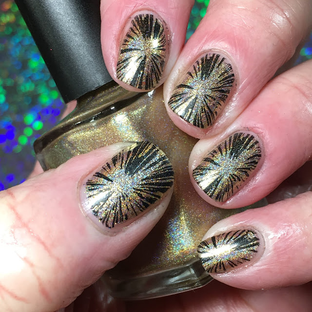 Applied decals on the stamper on all fingers except ring. The plates used were Creative Shop 36 (thumb) and Delaney Hiver A001 (index, middle and pinky). The ring finger was stamped using image from Maniology M036.