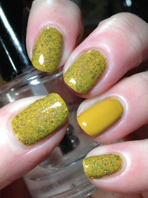 I had recently received an order from Painted Polish and was just itching to wear them! Started with a base of two coats of Painted Palish Cobra Clarity with accent of Painted Polish Stamped in Mustard.