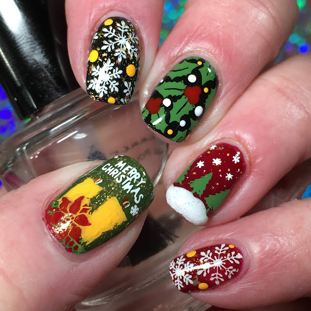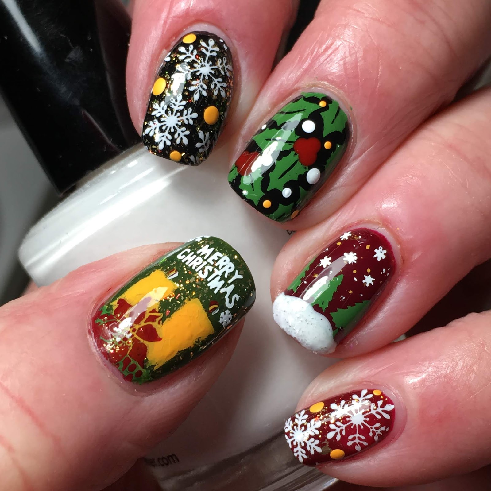 Stamped using Lina 4 Seasons-Winter 02 (pinky and index), UberChic UC Christmas 02 (middle) and Powder Perfect Christmas 1 (doubled stamped on ring). Dotted holly berries. Used Mdu 1, 9, 48 and 106. Added China Glaze There's Snow One Like You on ring finger tip.