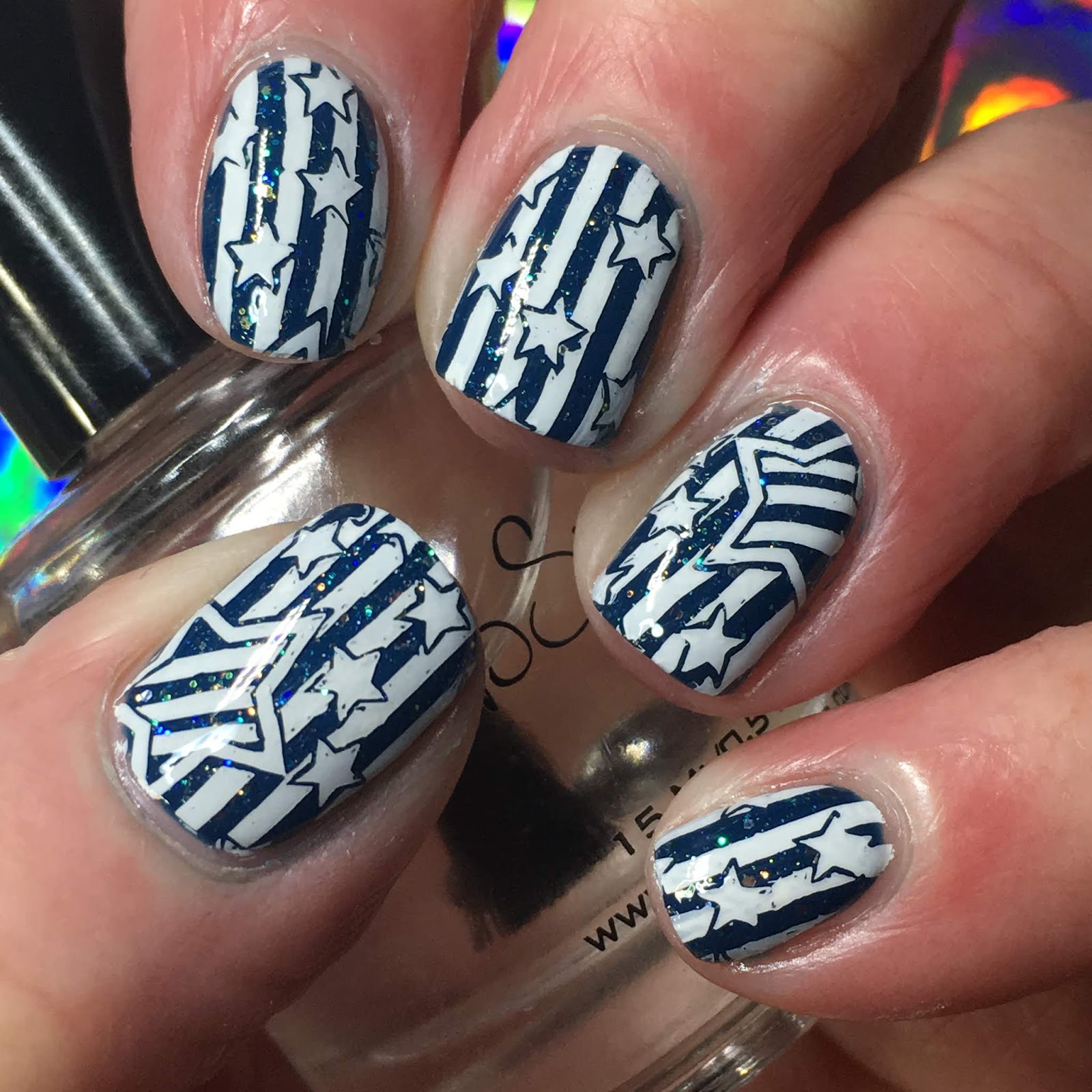 Stamped with an image from Mezerdoo B7 using MdU 1. Fortunately, my nails were short enough that I could do stars and stripes on most of the nails with the larger star and the stripes as accents, just for a little variety and interest. Another one of my favourite nail things to do; use different aspects of a image on each nail. I also used a fairly hard clear stamper as I find the softer stampers usually distort the lines so they aren't as straight as they should be. It seemed to work well; the lines look pretty straight overall. The clear stamper helps too with making sure the lines are placed straight too!