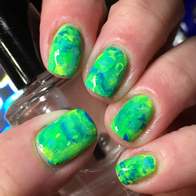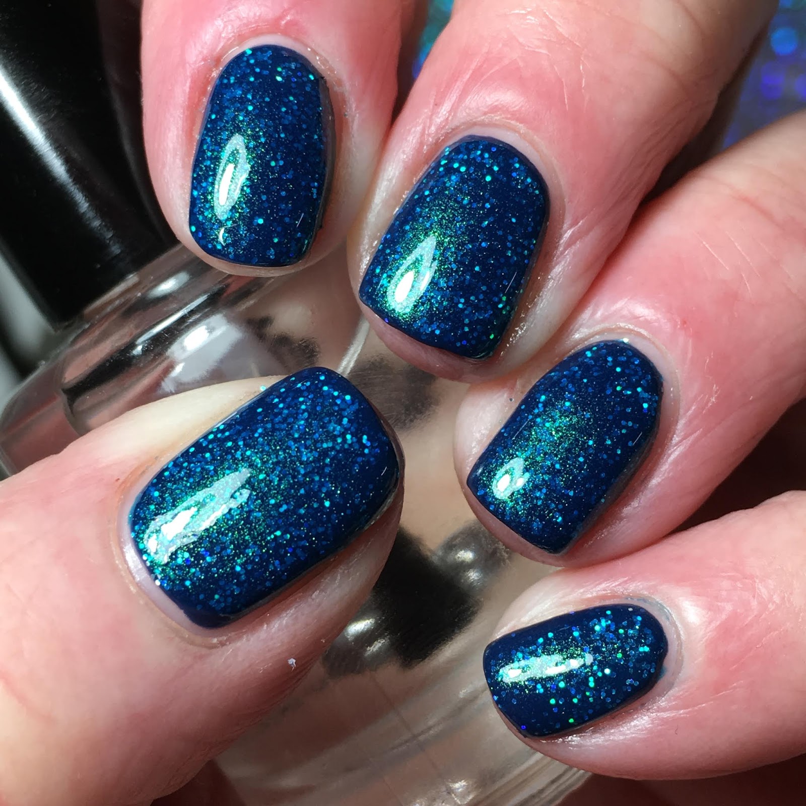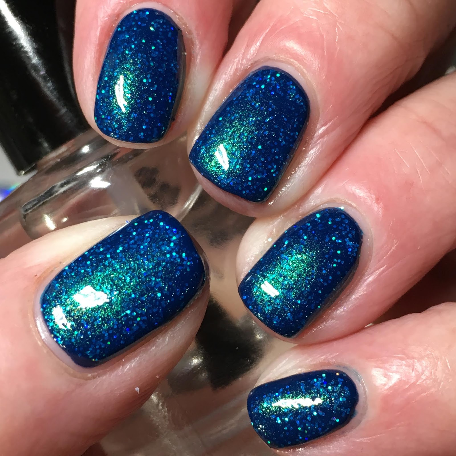 Layered with a coat of Yves Love 441. This was a random dollar store find many years ago. It is really sheer but I applied it thicker than my test nail so it covered up more of the holographic glitter than I wanted but you can still see it shine through. It also has a really interesting green shimmer to it which added a whole other level to the base!