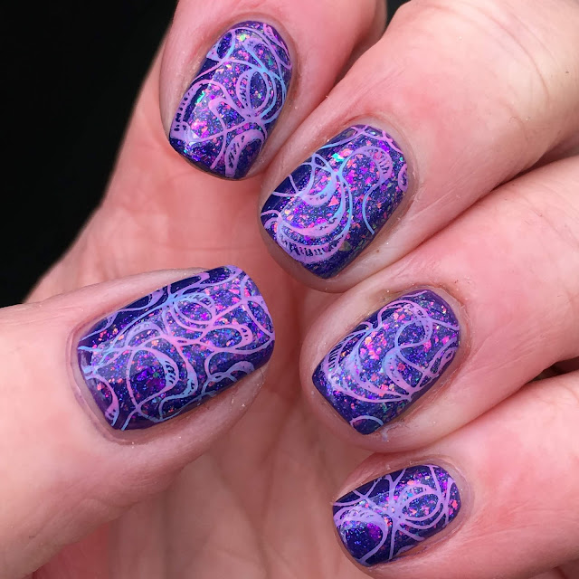 I think this turned out to be a pretty cool mani and is exactly what I love about stamping; an interesting image that you can see the interesting base below can make awesome nails!  Or in this case, the stamping saved the mani because remember, it was a fluid art fail that I went with anyway but it did end up creating a pretty cool base for the stamping!  Never be afraid to try out your fail; worst case is you've used some time and acetone and you have another canvas for your next creation!