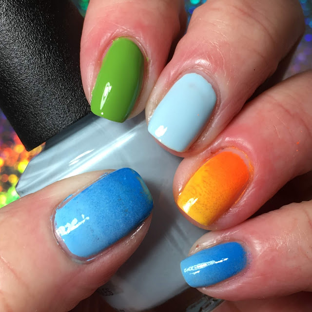 Started with a base of Zoya Tilda on index, OPI It's A Boy on middle, sponged gradient of Fancy Gloss Neon Blue and Blue Skies on thumb and pinky and Fancy Gloss Neon Orange, Neon Orange/Yellow and Neon Yellow on ring finger.  Topped with KBShimmer Clearly on Top.
