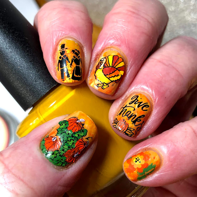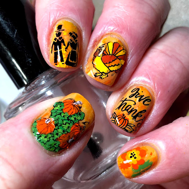 After making stamper decals for the thumb and middle using Delaney Autumne 003, applied them. Using a layering image from UC Mini: Hello Fall & Pumpkin Spice, applied it on the ring finger. Did another layering nail on the pinky using CjS LS-57 using a few different MdU polishes. The index finger was stamped first using BP-49 then double stamped using MM 23. Used mainly MdU polishes for most nails. I just love that thumb image; I had plans to do a mani with that image on all nails but just ran out of time as I've done so many other fall mani's! Hopefully, next year!