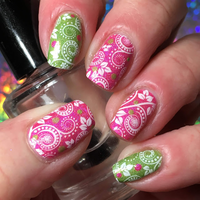 So I decided to add KBShimmer White Here, White Now on the beard and then on Santa and Mrs. Claus's fur lining and then restamped the holly and mistletoe again. For the thumb, removed the smeared stamping and base polish, then put on OPI Envy The Adventure topped with Painted Polish Grinch Green (mainly as I happen to have them sitting on my nail station from doing other mani's) and then stamped it with an image from Beauty Big Bang XL-030 (mainly as I happen to have it sitting there on my mani station to use for another mani) using Painted Polish Blanc Slate.