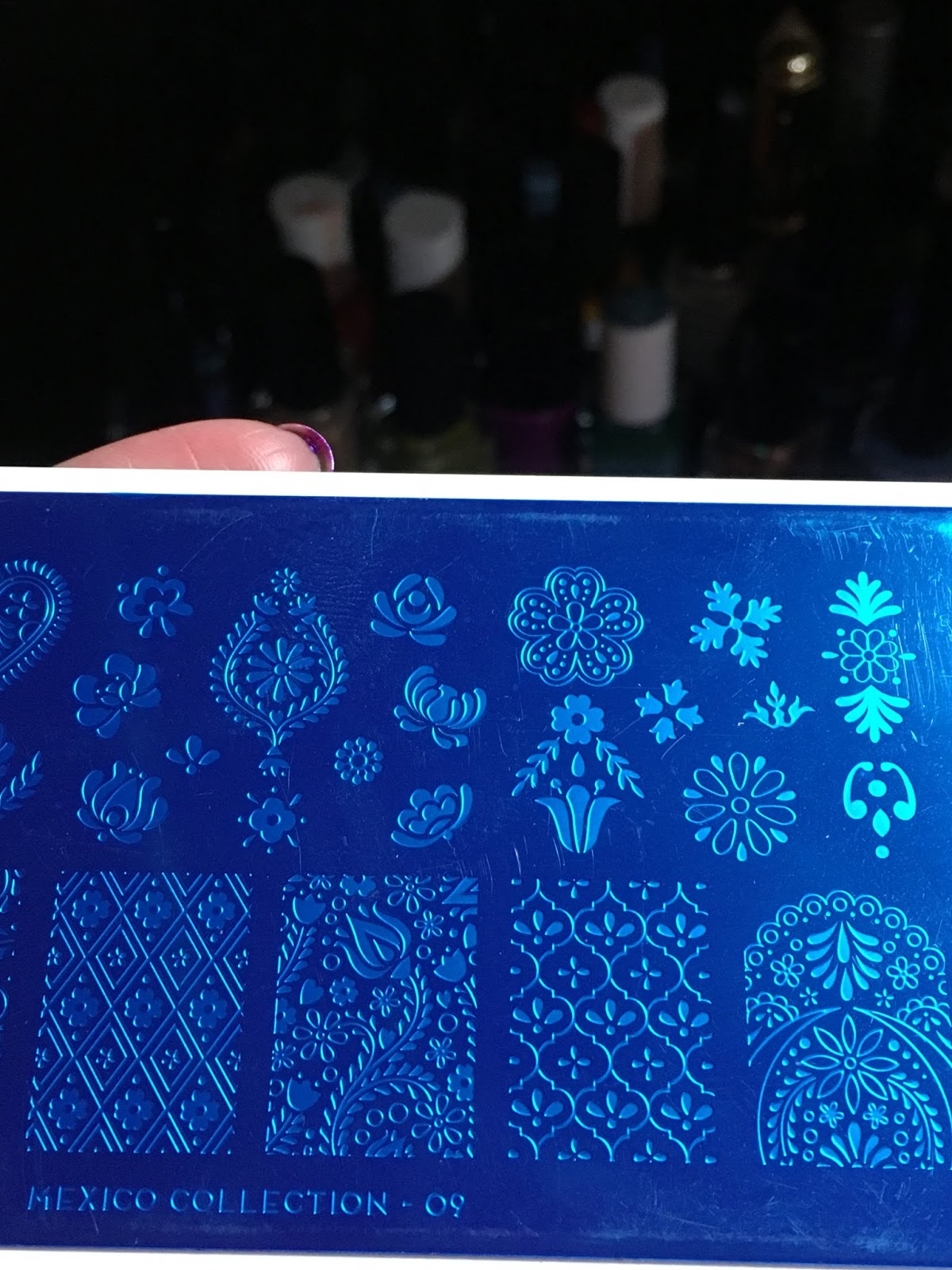 Applied stamper decals from images UberChic Christmas-01 (index), Wistonia The North Pole (pinky) and Delaney Noel 005, the did layered stamping on middle and ring finger using Clear Jelly Stampeer CJS C-34. Used Konad red, Painted Polish Midnight Mischief, Painted Polish Blanc Slate, MdU 84, Mdu 88 and another with no label, as well as a few different regular polishes for the stamper decals that I didn't make mark down.