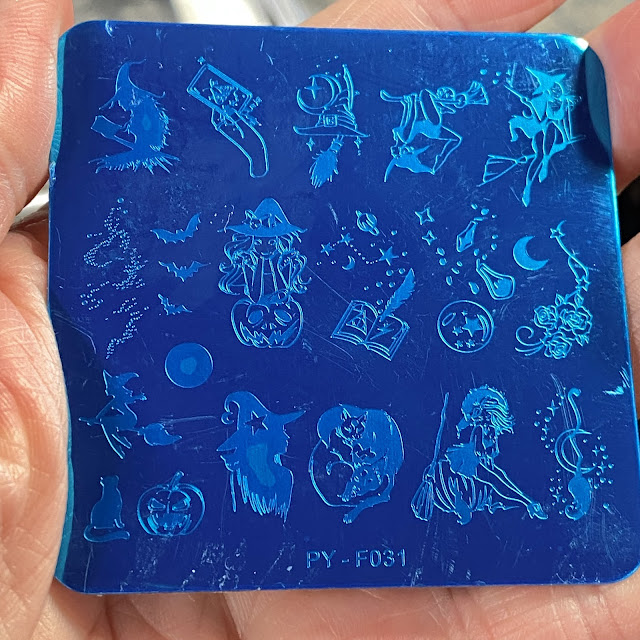 Shadow stamped words on middle using image from Manitude x Rock Your World using MdU 11 and 13, clouds and moon on index from Nail Matinee NM15 using Painted Polish Stamped in Slate and Painted Polish Blanc Slate, added tombstone from Marianne Nails n117 using Painted Polish Midnight Mischief, then individually stamped letters on it from Manitude Basics X Alphabet, image from Chez Delaney Musique 001 on pinky (shrunken) using Painted Polish Midnight Mischief, and SugarBubbles SB064 on thumb (again, shrunken as it is mammoth on my small nails!). I have to say that the image placement on the thumb is just as good as it can get! A clear stamper doesn't mean an image is still going to go where you intend it...at least not when I apply it.
