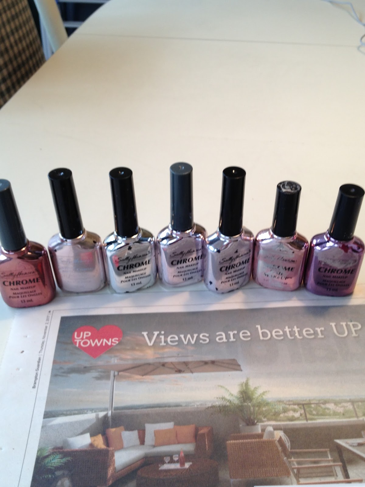 Sally Hansen Chromes $3 each: Lilac Diamond, Turquoise, Ruby Rose, Peach Crystal, Petal Crystal, Gold