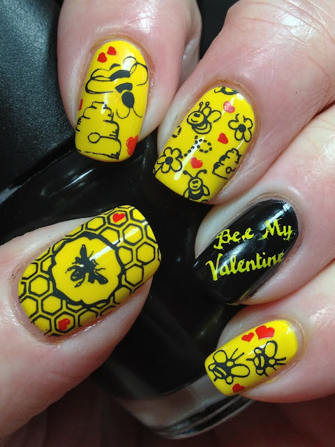 Isolated the smaller beehive and bees from the full size nail design and added them to a couple of the nails as seen on the index and ring finger here.