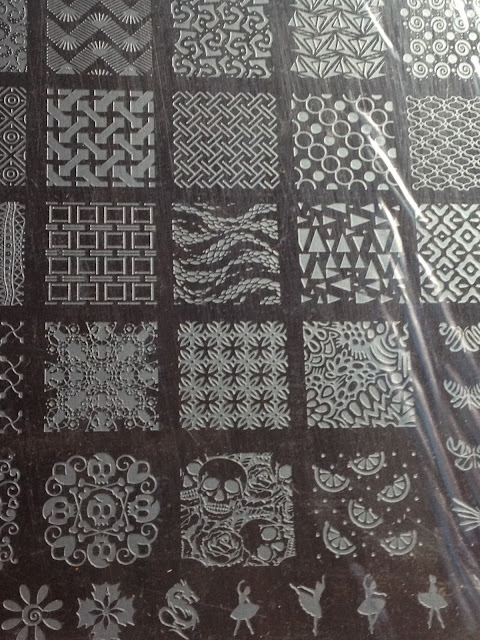 Added stripes using Delaney Linges & Traits. I tried several clear stampers but any of the squishy or semi squishy make wiggly lines so found that the Original Clear Jelly Stamper - second version, worked well to keep the lines straight. Of course, even with a clear jelly stamper, I messed up on placement, so pinky isn't the best. But I had already stamped some of these so many times trying to figure out which clear stamper wouldn't stamp wiggly lines, so decided to live with it. Middle image is from Apipila Super Place F; used FunkyFingers Gesso.