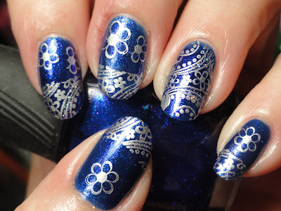 At this point, I've gone too far to remove the design and its far too late at night to start another mani. So I thought I'd add some flower accents to be a distraction against the stamping. Used the flowers in SdP E. Silver stamping polish used is Nicole by OPI Positive Energy. The silver foil contrasted well with the blue foil. To finish it off, I added a couple swirls of holographic glitter.