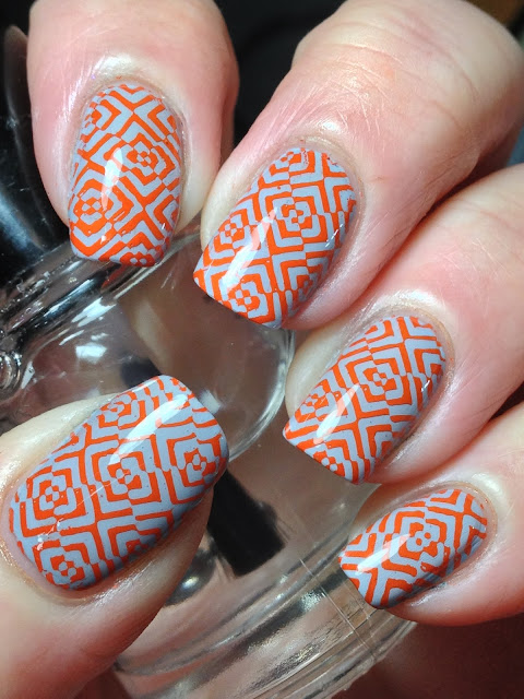 Orly La Playa, topped Nicole by OPI Top of My World (part of giveaway); stamped using Nicole by OPI Give me the Moon using fauxnad Big SdP I.