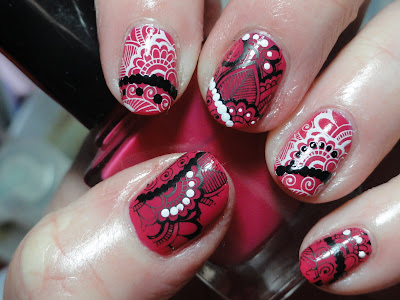 Fingers...pay attention here! I've had my share of fails with white Konad special polish (well, if I'm honest, more than stamping polishes!!) and there are still lots of times when I get stamping polish drag when I apply my topcoat. Another problem I've encountered with white stamping polish (actually it will happen with regular polish too) is that if you apply SV topcoat while it is still kinda wet, the polish disperses and kinda fades so its not a crisp, clear stamped image. An example of this is my