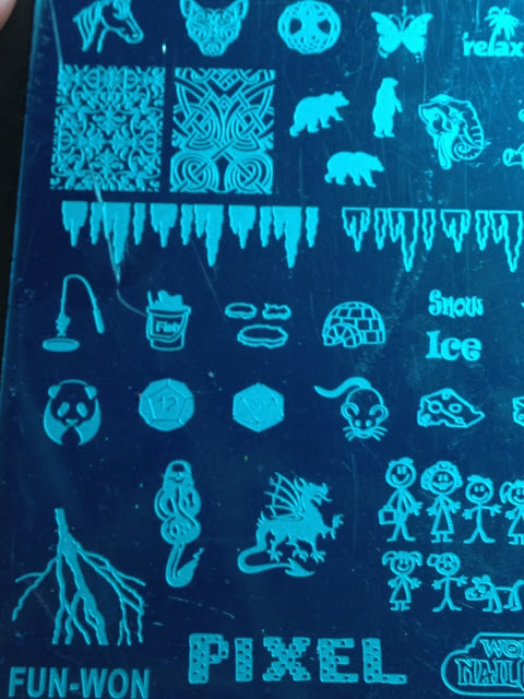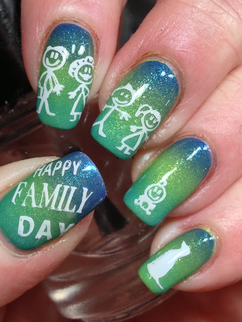 I used the stick family images from the FAB UR NAILS WON-FUN plate after shrinking them using the UberChic luxe stamper.  Unfortunately, I couldn't get the dog on the plate to shrink enough to fit on my pinky so used an image from MJ II for it.  The words on the thumb are from NailMatinee NM12 and Nailways Back to Basics ABC 123; Funky Fingers Gesso was used as the stamping polish.