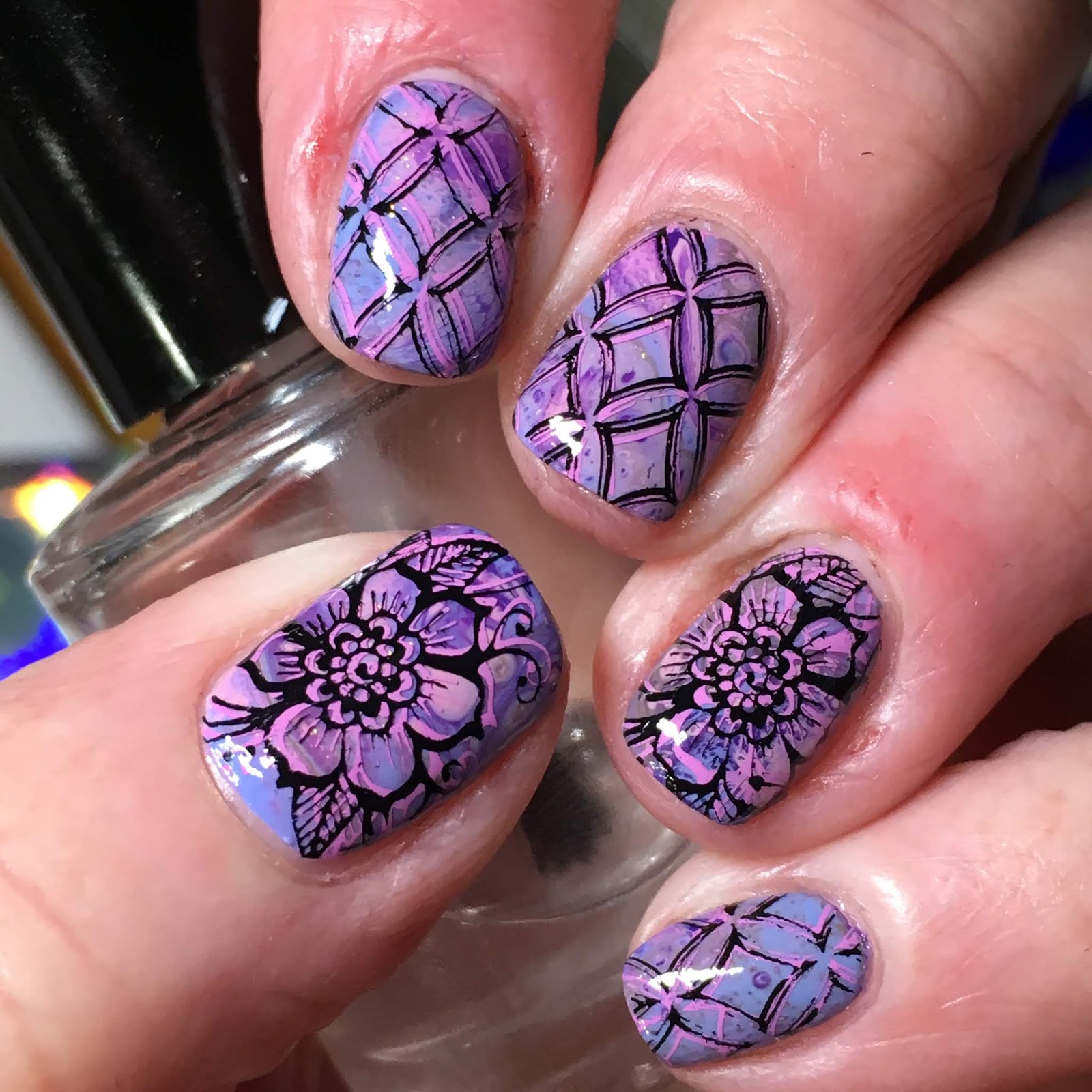 These were the polishes used. I added a light pink shimmer as I like the shimmer look in my decals.They are Sally Hansen Miracle GelSugar Fix, Savvy Fairy Twinkle, OPI Another Ramen-tic Evening, Sally Hansen CSM Mardi Grape and Zoya Jana.