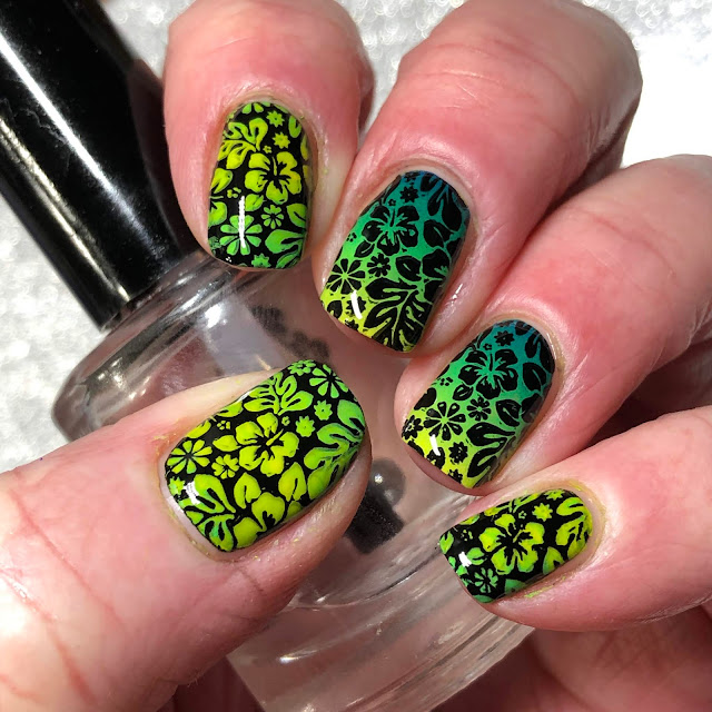 I didn't start these nails until around 1 am so while I initially wanted to do a gradient, I decided to do something quick so went with a stamper smooshy base of Fancy Gloss Neon Yellow, Neon Pink, Neon Orange and Neon Orange-Yellow. The great thing about these neons is that no base polish is needed so I stamp these directly on my clear base coat. And this is one stamper smoosh and it did all the nails (probably because I use too much polish) but because the polish is so opaque, I don't have to layer and layer to cover thin spots. This method is quick for me so I use it when I want an interesting base but no time.