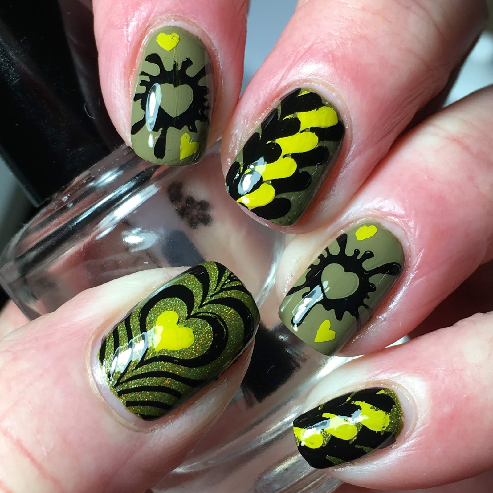 I have a few Valentine's Day manis to share before the day of love arrives!  As in the past, I try to do some untypical holiday mani's to shake things up a bit!  This is one that, believe it or not, started by me observing an army green car on my way to work and I decided right there that army green nails were going on that night! That turned into a Valentine's Day mani with some unusual colours; here's what I came up with!