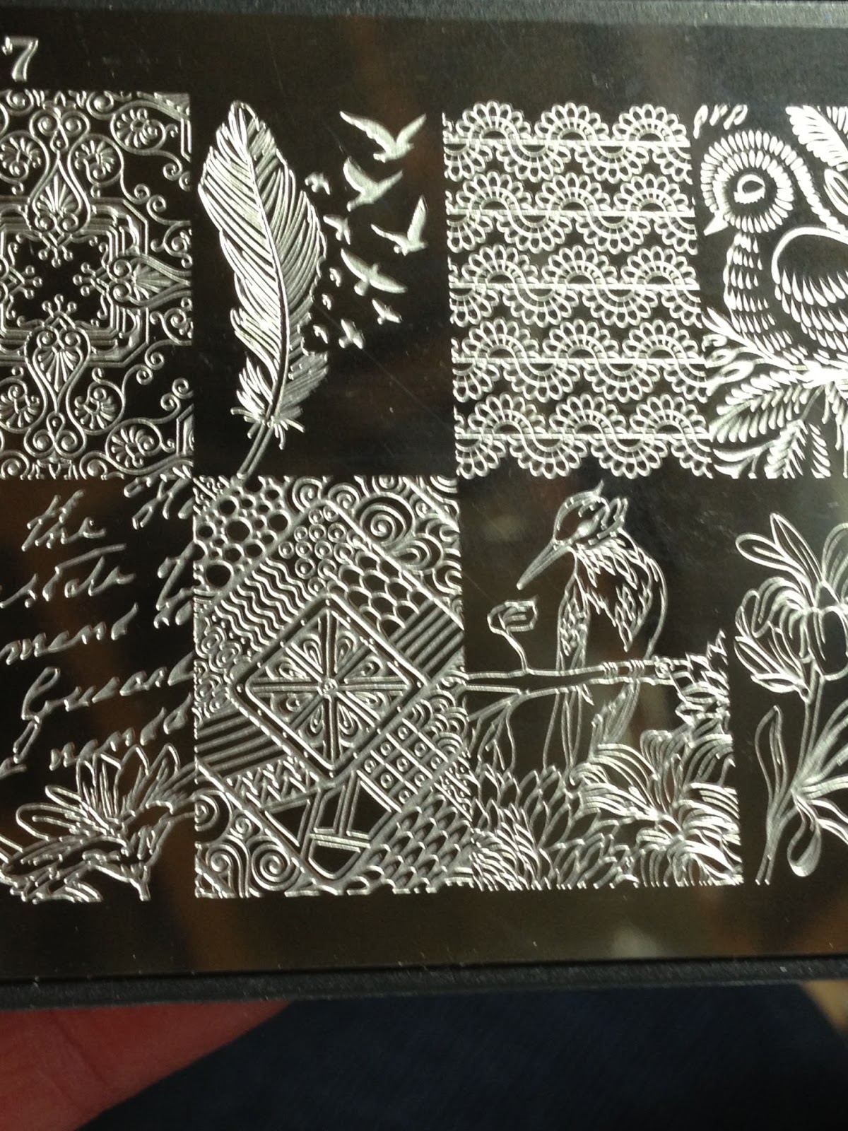 Started with a base of two coats of OPI Black Onyx, no top coat. This actually isn't what I had intended; I wanted to do a grey accent nail and then have black stamping on top of it to change it up a little but I was concentrating so hard on applying the black to avoid cleanup and flooding that I painted my accent nail before I knew it! Well, that and singing along to some awesome music at the time but I got distracted! I just decided to go with it anyway! But it kinda ticked me off because I took so long searching my stash for the perfectly matching polish to match the stamping polish!
