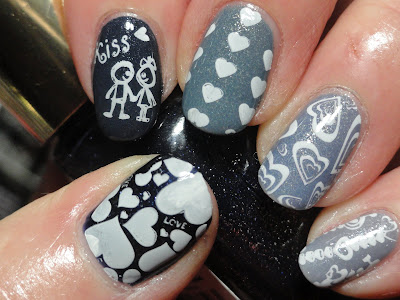Plates used were CH15 (thumb), CH15 (ring finger), CH29 (adorable couple on index), CH27 (kiss word on index), CH3 (heart on middle), CH16 (heart on index beside kiss) and then Big SdP B on pinky, stamped using Konad white special polish.