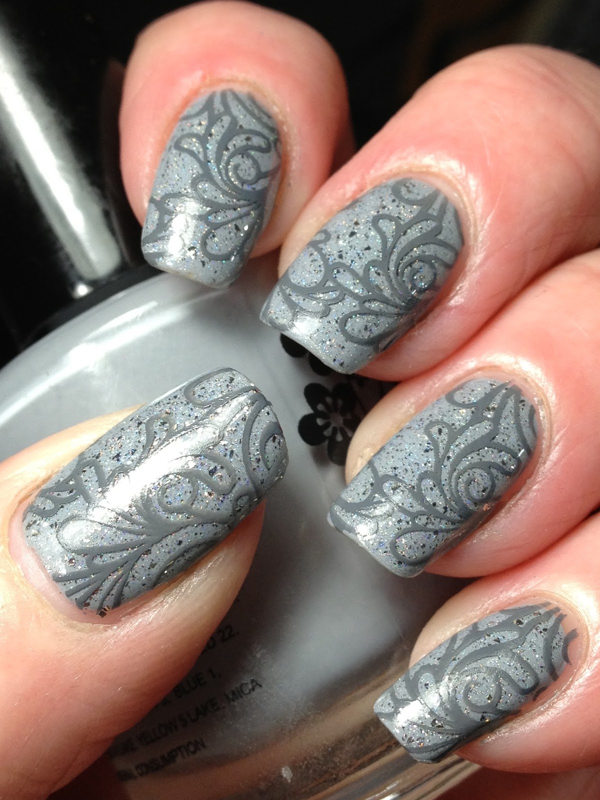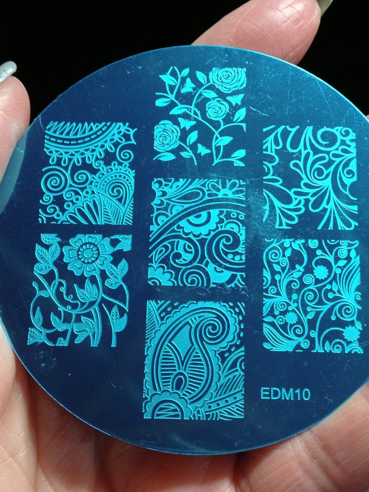 Stamped using an image from Emily de Molly EDM10. This is another one of those images that has lots of voids so you can see the beauty of the polish base through yet is a pretty interesting image all by itself. This would also be a perfect image to make a stamper decal. Topped with Girly Bits What A Rush QD TC to finish.