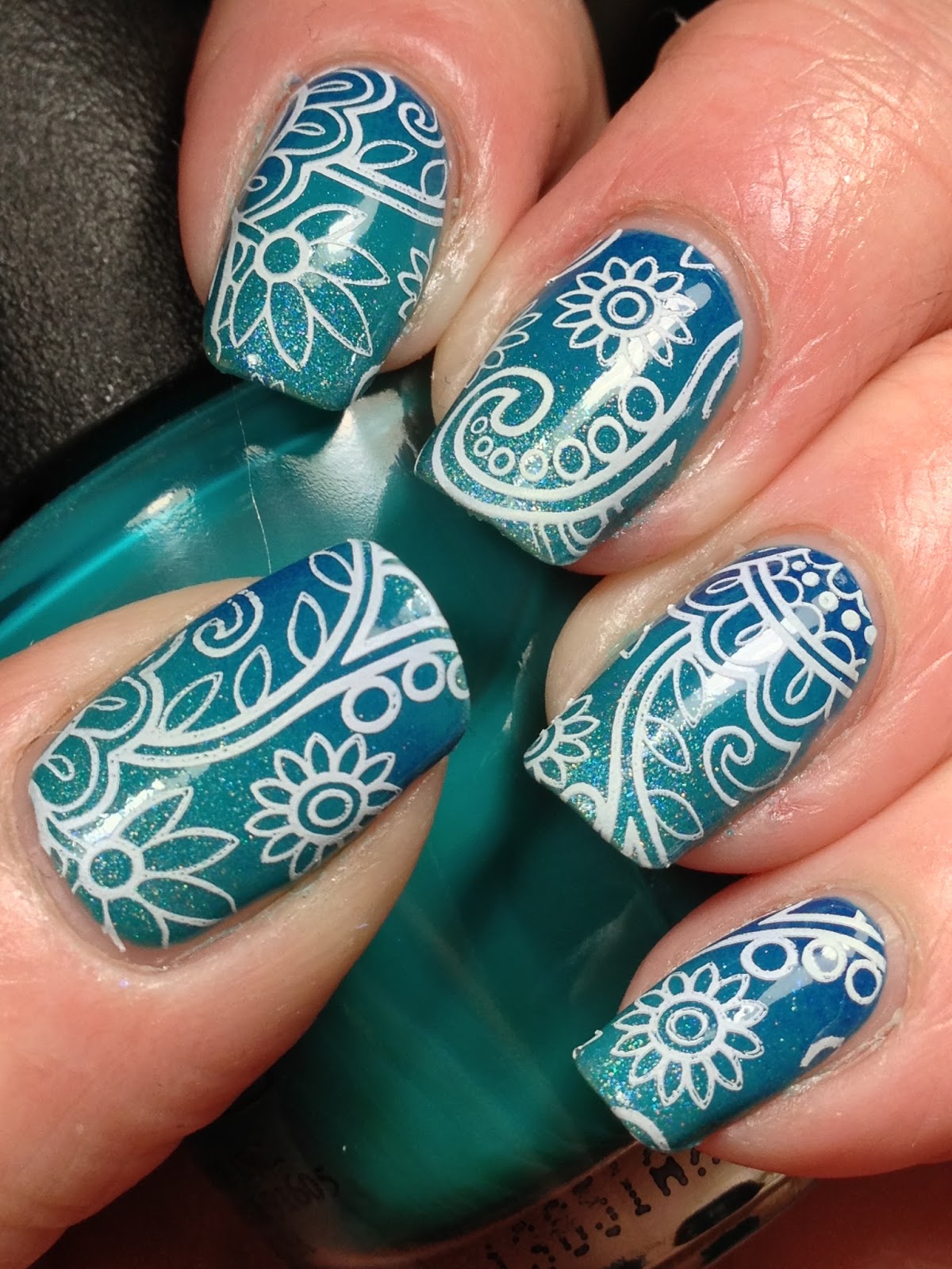 I did the white base for a water marble design that would have been the background for some stamping, but try as I might, the water marble gods were not with me and I had no luck with doing a proper design. After the third attempt, I just took what was in the water, swirled it around, dipped my finger in and hoped for the best. It wasn't that bad; in fact, who knows, this might have been better than the real water marbling. Anyway, it was late and I had spent enough time on it so just ran with it.