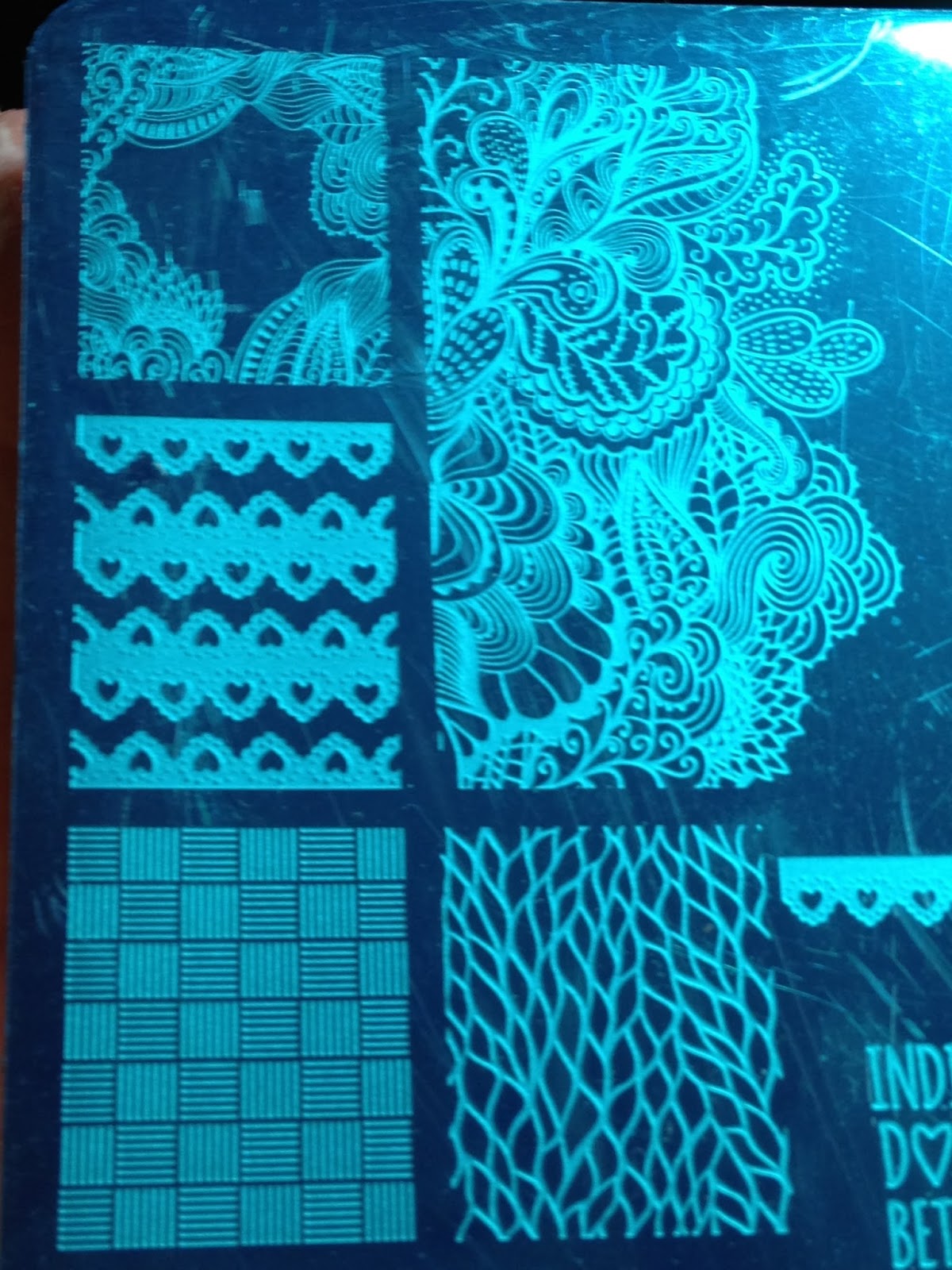 No pix of finished water marble as some were really bad and the stamping covered the fails BUT I had this happen to my index finger on my first attempt to stamp on top of the water marbling.  I'm guessing it was from too much wet polish from the water marbling and smudged when I stamped.  So while I was doing cleanup, removed it and redid another water marble design on it.
