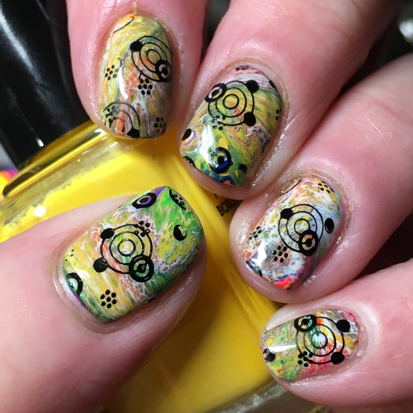 This is my fluid art. I didn't keep track of polishes as I was just doing one after another after another for testing purposes, etc. But it the results are colourful, that's for sure! This was actually one of my more successful trials as had lots of fluid cells. Not overly big but lots anyway!