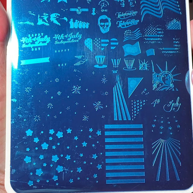 Stamped using Wistonia American Pride with Painted Polish Blanc Slate on middle and ring, Maniology M327 for words on thumb and CjS-62 using Painted Polish Blanc Slate, MdU 73 and red Konad Special Polish.