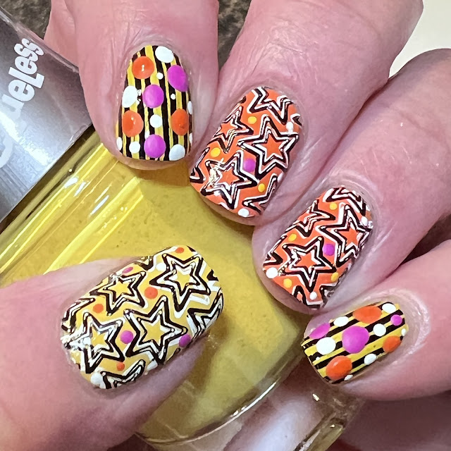 I call these Halloween bonus nails as I did these nails mid summer for a weekend Halloween event, but didn't have any Halloween stamping plates or (what I would use for) Halloween polishes. But I tried to make it work with what I had on hand and thinkthey turned out pretty cool! They were a lot brighter than they appear here; however, the lighting washed them out a bit but hopefully you still get the idea of them. Here's what I came up with!